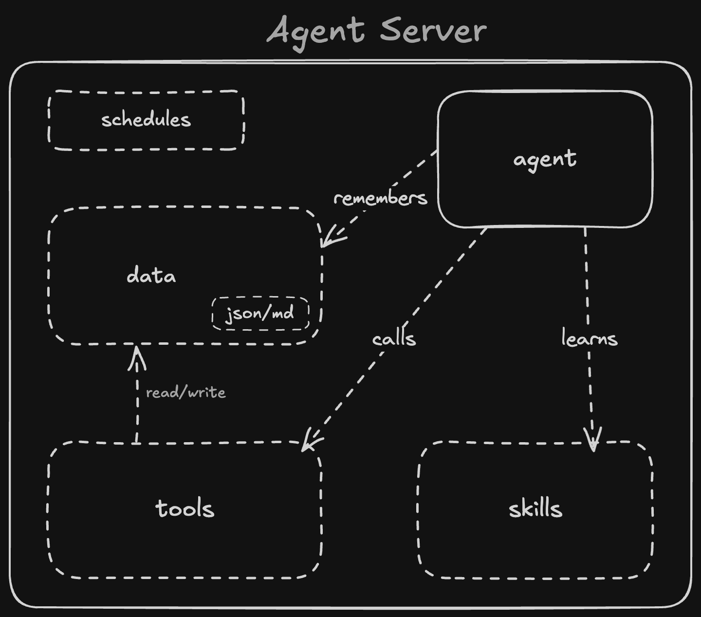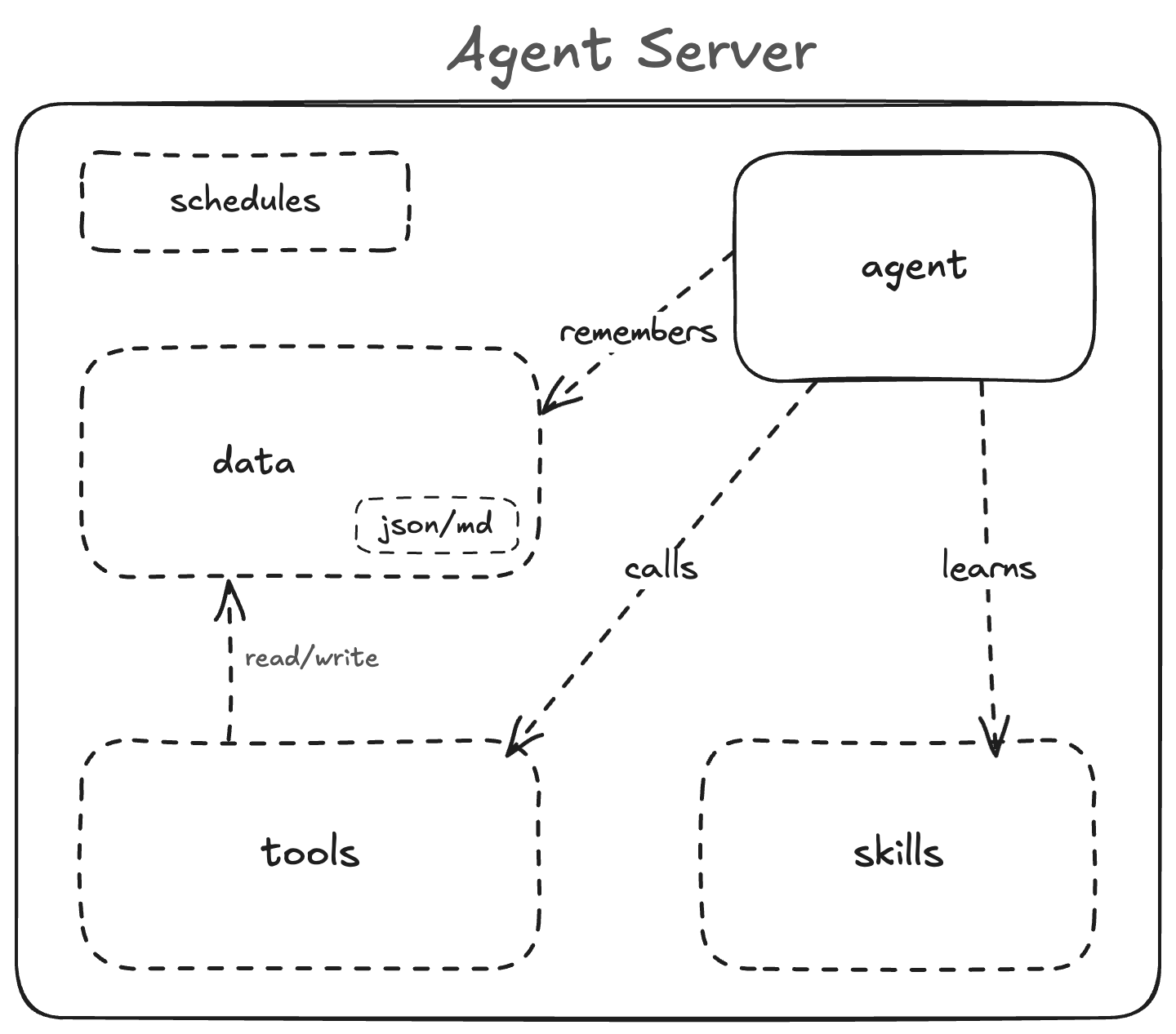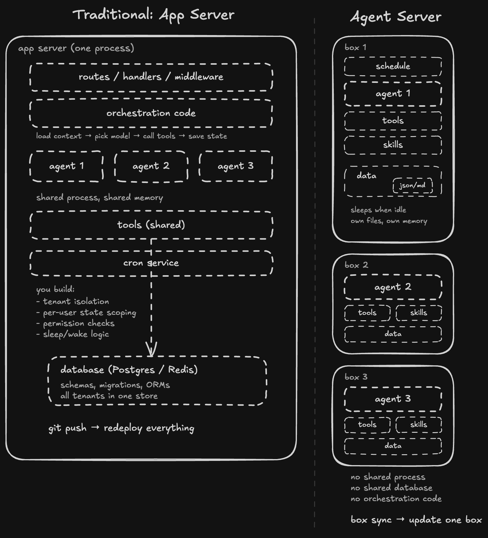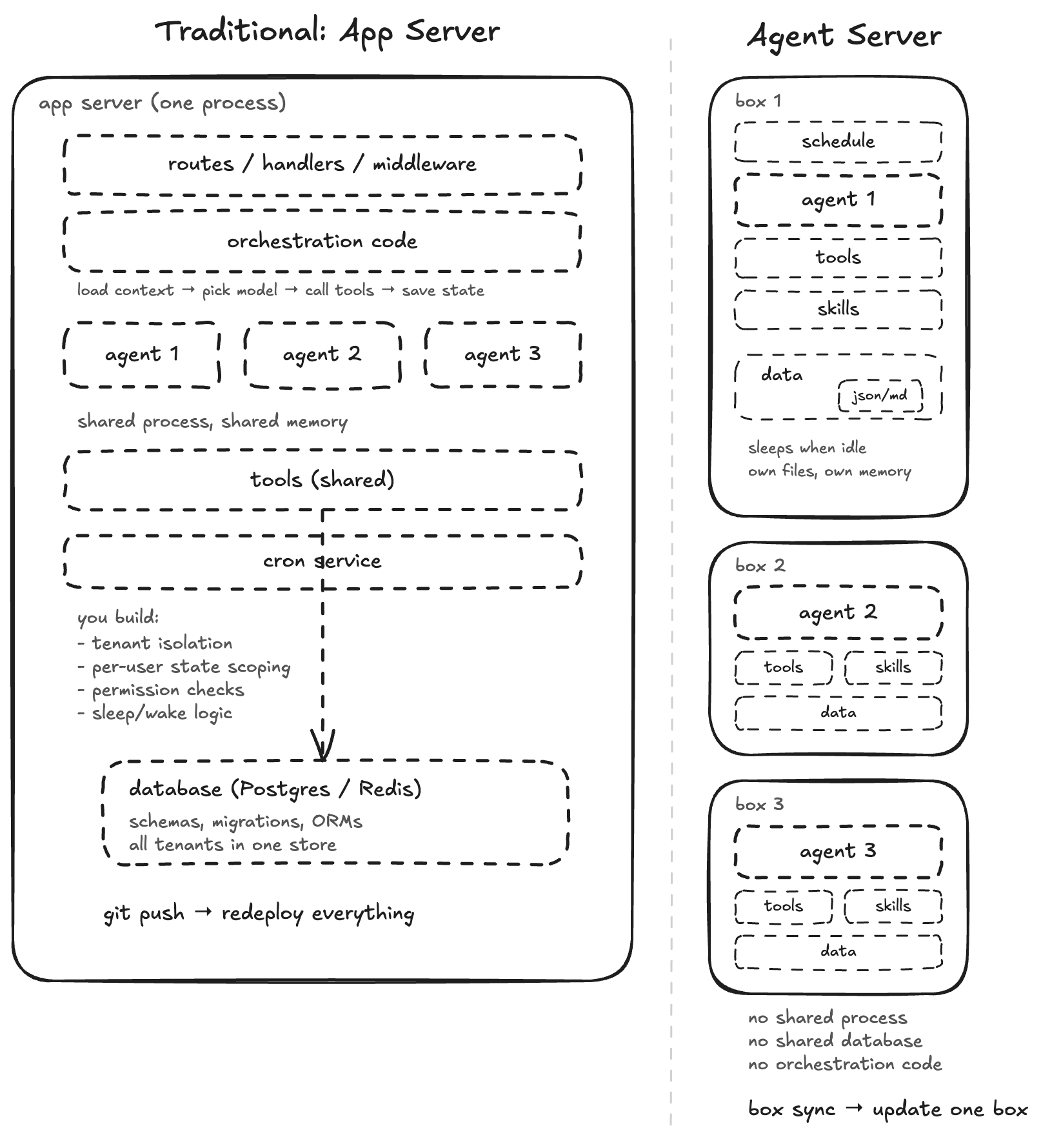 - No orchestration code. An app server needs glue code: receive request, load user context, pick model, call tools, save state, return response. An agent server removes all of that. The agent reads its skills, calls its tools, writes its data. Zero lines of orchestration.