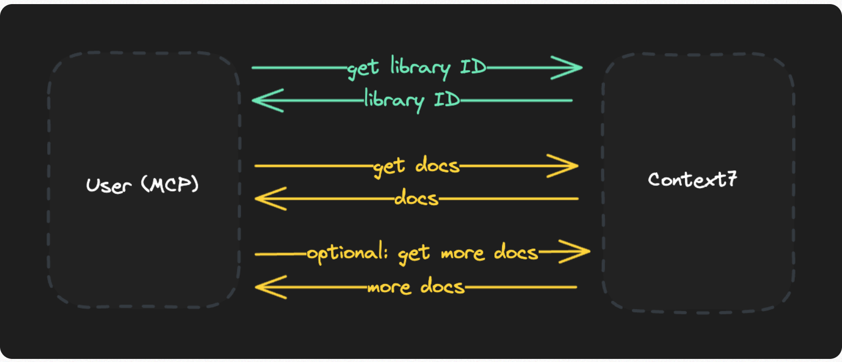 Previously, Context7 worked like this: when an AI makes a request through MCP, it's a two-step process. The first call resolves a library name to a Context7 ID. The second call fetches the actual documentation from our vector database: