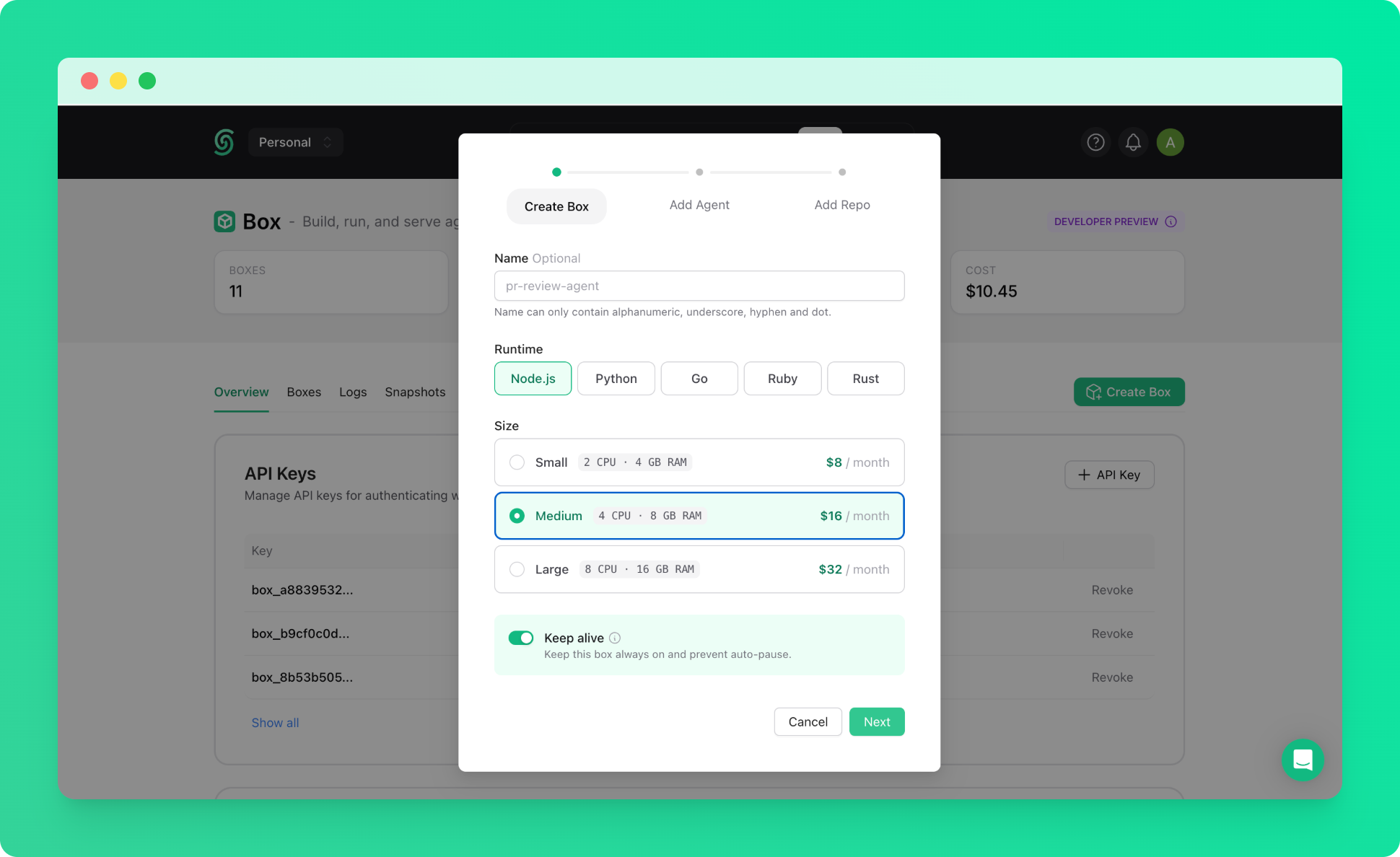 Create a keep-alive box with the Medium size. See the quickstart if you haven’t created one before.Hermes is resource-intensive, so we recommend starting with a Medium box to ensure a smooth installation.