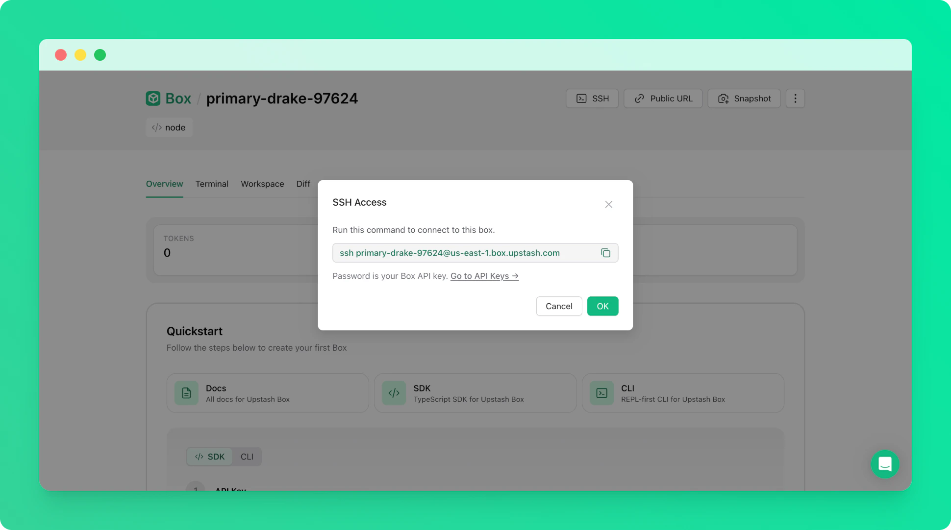 Once the box is running, connect to it via SSH from your terminal. Use your Box API key as the password when prompted. Thebox-id is the name of your box (e.g. right-flamingo-14486).
